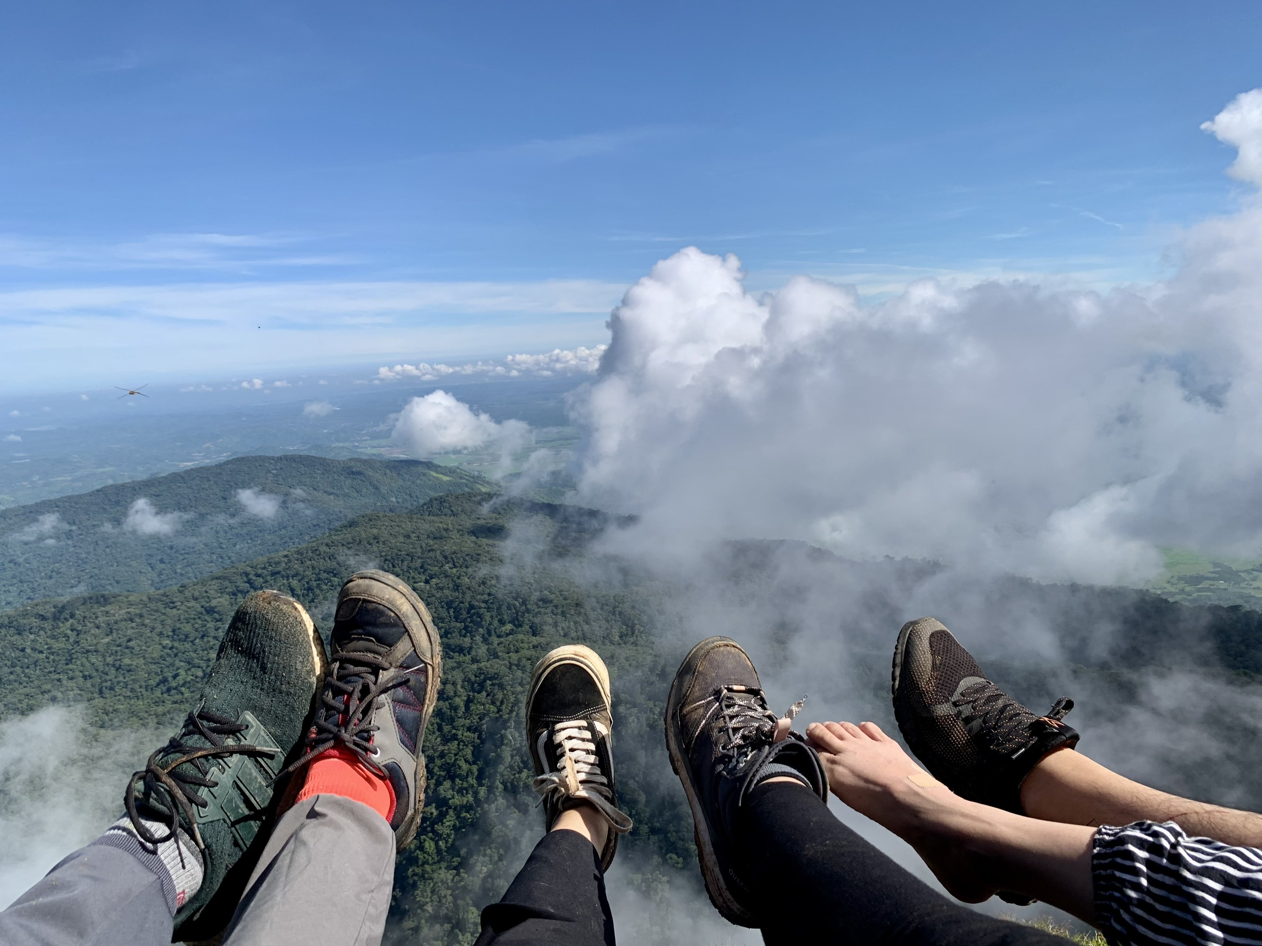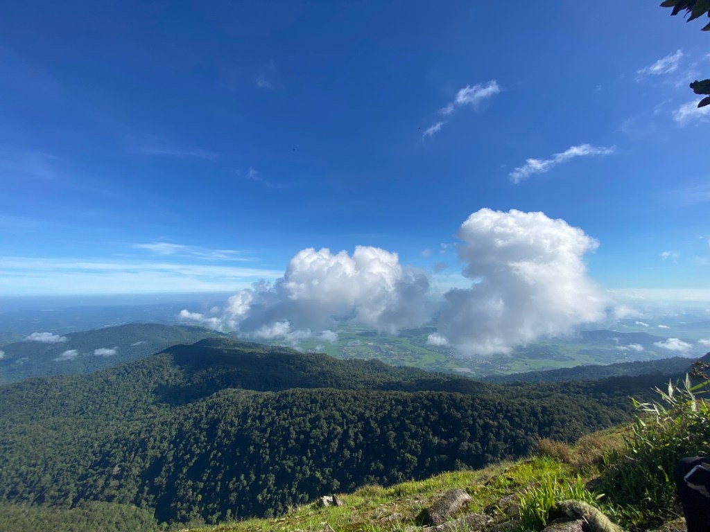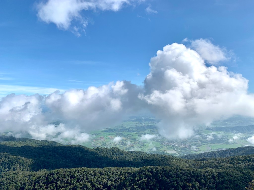 Từ trên cao, tụi mình có thể nhìn được phía bên này mưa, phía bên kia nắng, mây sà xuống hay bay xa, những đám mây cùng nhiều hình dáng. Từ trên đỉnh núi, trông chúng như một biển mây. Gió nổi lên thì mây sẽ thay đổi hình dáng, cứ như những đợt sóng trôi hiền hoà. Như thể mình được xem những đợt sóng biển tua chậm rãi, để thong dong ngồi chiêm nghiệm vậy.