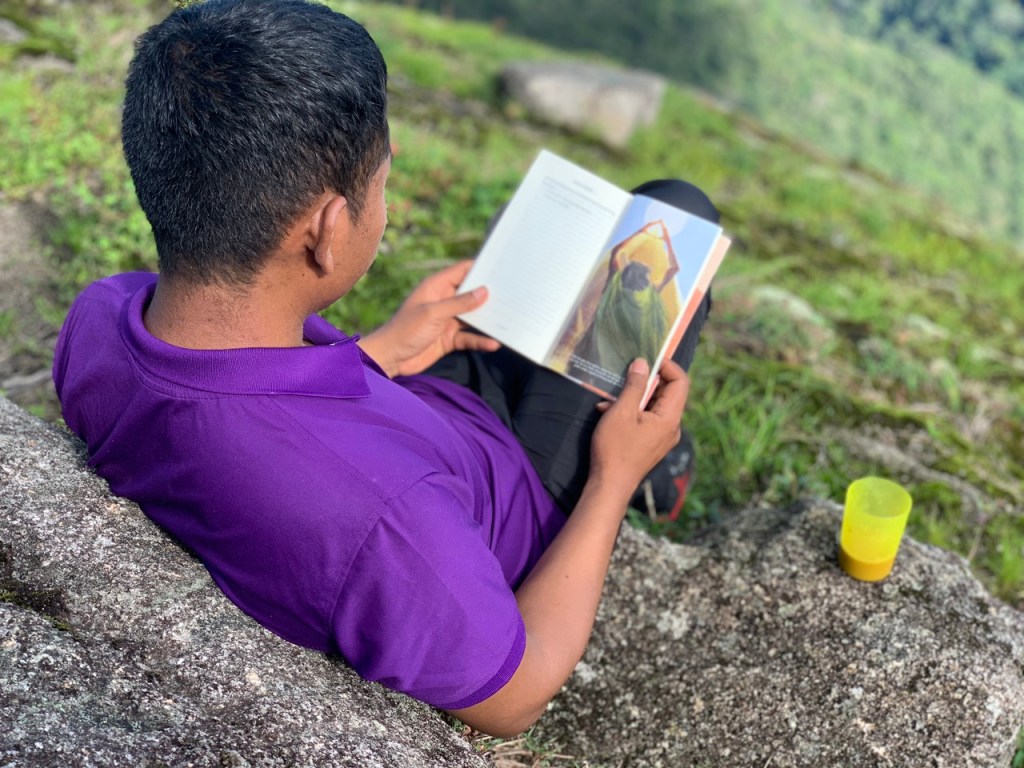 Vì leo núi nên mình nghĩ mình sẽ mải ngắm rừng nên không đem theo sách, ấy thế mà tình cờ phát hiện Linh đem theo cuốn Nhà Giả Kim thì mình thấy vui lắm. Cứ gặp ai cầm sách là mình thấy vui, lại còn cuốn sách mình thích nữa. Thì bất chợt, anh Xim cũng bảo “Đó là cuốn thay đổi suy nghĩ cuộc đời anh rất nhiều”. Như thể một điều gì đó ánh lên, khoảnh khắc ấy mình chỉ cảm nhận, và ngồi lắng nghe câu chuyện, lời chia sẻ của nhau giữa núi rừng bạt ngàn. Bỗng nhiên mình thấy tụi mình nói chung một thứ ngôn ngữ, đó là ngôn ngữ của tâm hồn.