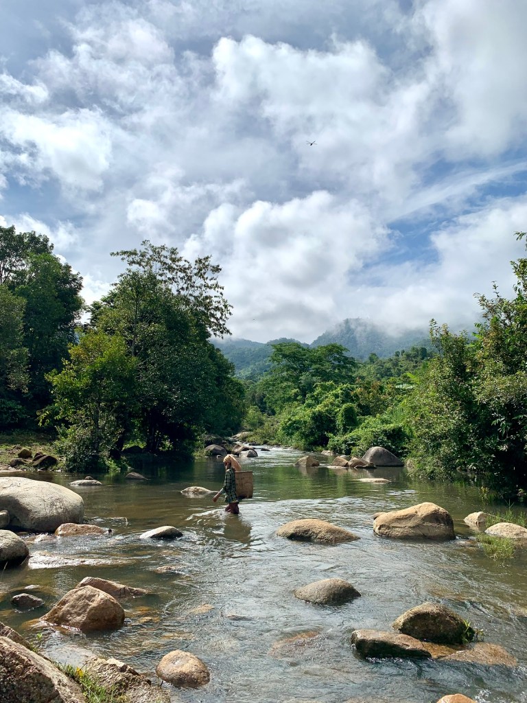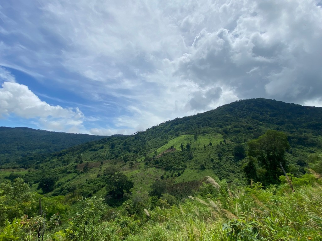 Để đến chân núi, tụi mình di chuyển bằng xe máy cày từ nhà sàn trong thị trấn, băng qua những cánh đồng xanh mướt thênh thang, những dãy núi trùng điệp ngút ngàn ẩn ngọn sau những tầng mây, những rặng cây cao bóng cả, những người dân tộc với nước da bánh mật đeo gùi sau lưng… những hình ảnh ấy cứ lùi dần về phía sau. Ngước lên phía trước, bình minh như đang dang rộng ánh nắng đón chào tụi mình vậy. Mình cứ để nắng và gió tướp táp vào mặt như thế. Mình thấy nhẹ nhõm.